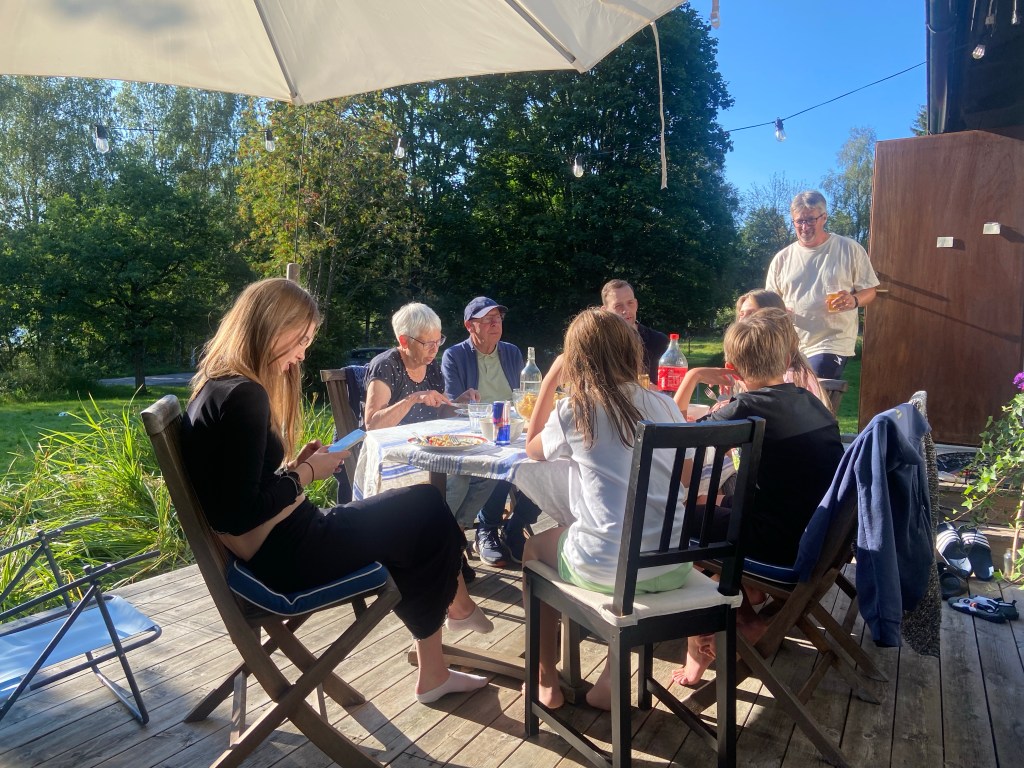 Med somriga bilder och blå himmel. På fotot ovan träffade vi syrran med familj och deras vänner som gästar Sverige just nu. Och här lyckades jag få med äldsta dottern till sjön.