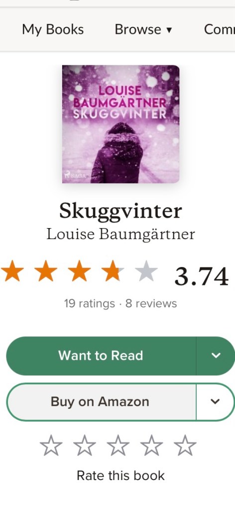 Förresten, på tal om böcker berättade jag nyss att Skuggvinter hade 3.74 i betyg på Goodreads, här kommer en bättre skärmdump på det än i förra inlägget. Hoppas att du som kikade in mår bättre än jag. Trevlig kväll eller dag, beroende på när du läser.