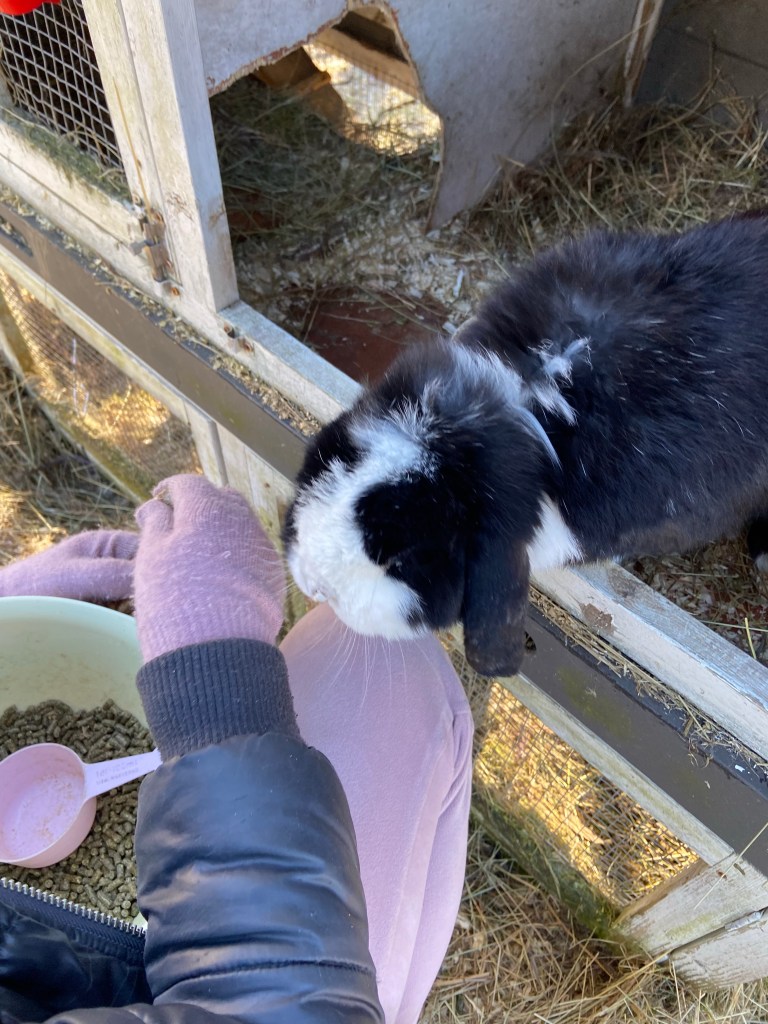 Jag och min yngsta började även söndagen i skogen. Mina promenader ligger nästan alltid på förmiddagen, då är jag piggast. Vi avslutade med att ge kaninerna mat, på fotot en hungrig Mumrik.