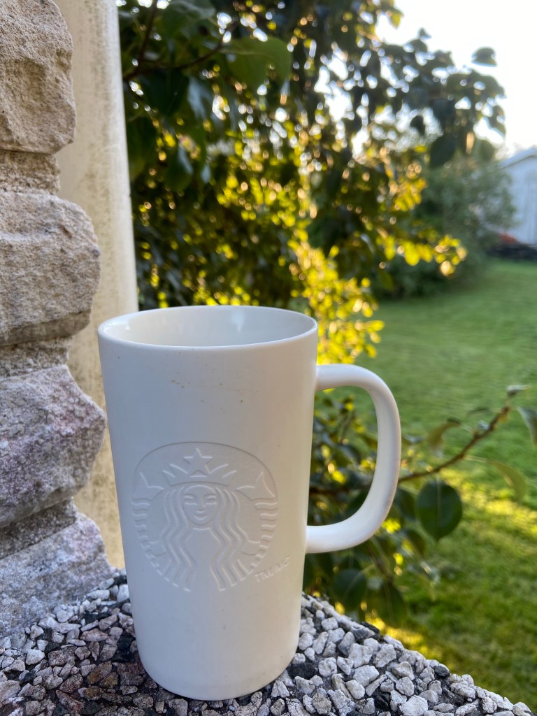 Jag går oftast upp tidigt, i dag kl. 06.15. Och fotade min favoritmugg från Starbucks, ute på altanen, till detta inlägg.Påmorgonen skriver jag alltid på laptopen i köket, då stör jag ingen. Jag brukar sätta på lugn (ordlös) musik och timern på mobilen.