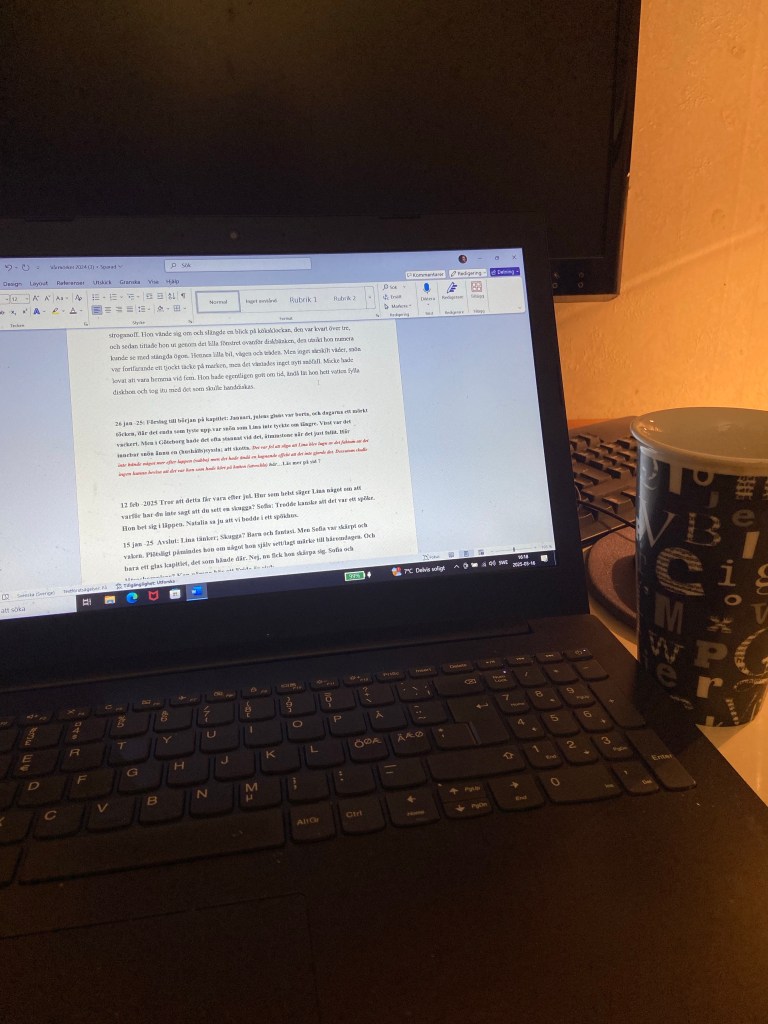 Mitt i allt skriver jag på mitt manus Vårmörker. Och jag har faktiskt lyckats med ambitionen jag nämnde för ett tag sedan, att öka skrivandet. Vet ni vad det mest kämpiga med detta varit? Det är inte att skriva mer, utan att avstå från att göra saker i hushållet. Sådant som inte ens är mitt att göra. Många av er vet precis hur det är.